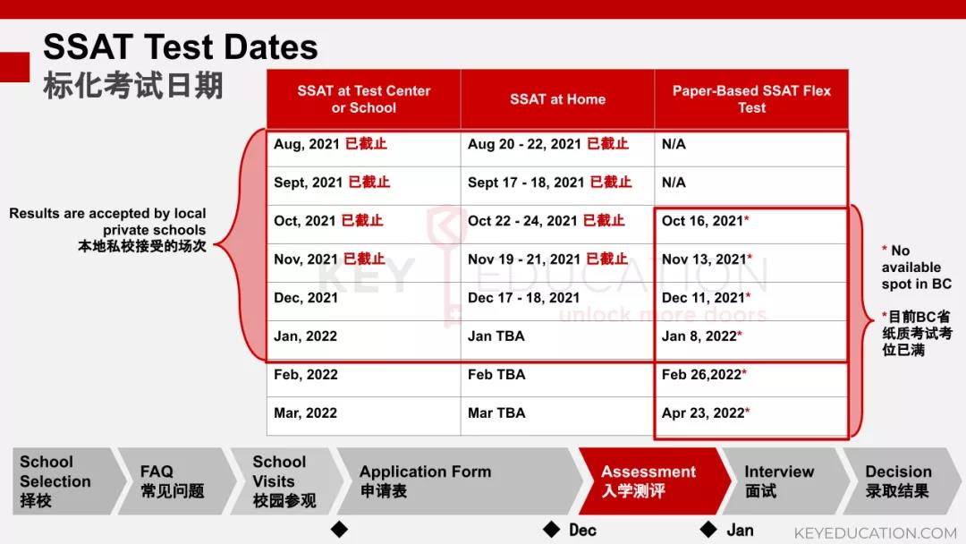 截止目前,大温私校中,除St George‘’s 的团体测评正在进行中以外,其余已经公告日期的私校,普遍将招生年的测评时间安排在12月-明年1月之间,而非招生年的测评时间则在明年2月之后。家长们务必把握好最后的时间,做好针对性的准备。