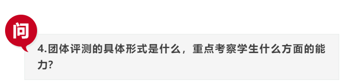 同时,虽然有分为线上与线下的形式,但测评的本质并没有变化。团体测评中,学生需要在组成小组,在有限的时间内共同研究一个特定的项目或解决一个问题,并在讨论结束后进行发表。