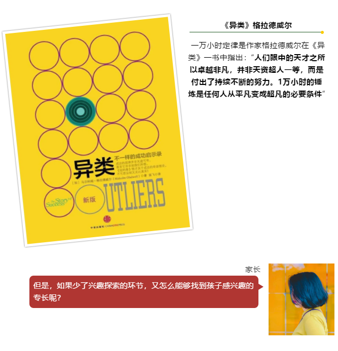 每个专长都需要花费的一定的时间与精力来培养,经过特定的时间达到一定的程度后,孩子才会意识到自己有这方面的天赋或热忱,并想要持续提升。也就是所谓的"一万小时定律"