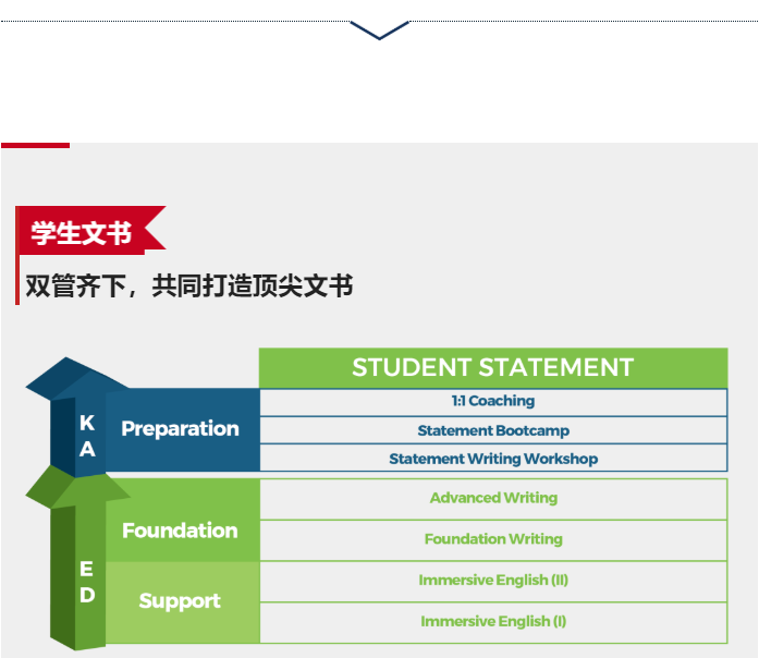 优秀的写作能力是完成高质量文书的基础。在KEY,我们会根据学生在入学评测中的表现,安排他们参加符合当前能力水平的沉浸式英语课程(Immersive English) 或基础/进阶写作课程(Foundation/Advanced Writing),进行有针对性的提升,确保他们拥有撰写合格文书的能力。