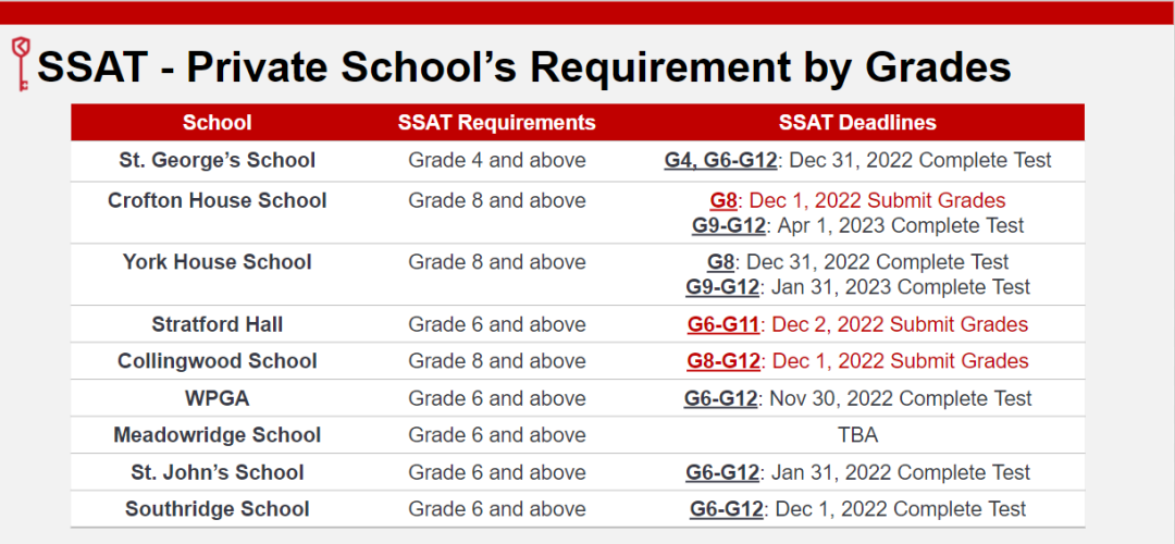 谈到入学测评,许多G2-G11年级的家长第一个想到的就是SSAT考试了。由于校体系中的课程强度很高,为了确保学生入学后能够跟上教学进度,大多数私校都会要求申请者提供SSAT成绩,或是参加校内的学术测试,以下是今年大温私校对SSAT的要求与截止日期: