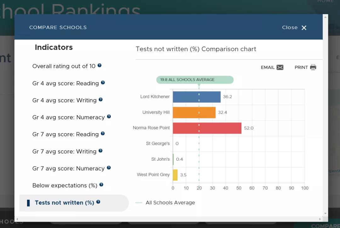 抱着实事求是的精神,我们在Fraser Institute 上分别勾选的温哥华西区的6间学校(公、私校各3所)进行比较,就结果显示,在“Test not Written(未作答比例)”栏位。温西3所公校的考试未作答比例明显偏高,如图中的Norma Rose Point出现了高达了52% 的比例,University Hill 也拥有32.4%的未作答比例。 这会大大影响最终排名的结果,导致其缺乏真实性,影响家长们的判断。