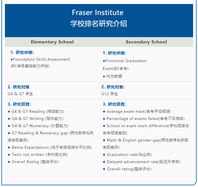 加拿大著名智库Fraser Institute(菲莎研究所)每年都会依照省级的测验成绩,进而分析加拿大中小学的学术水平表现,而得出学校的排名,因此也成为了许多家长在择校上不可或缺的参考依据。