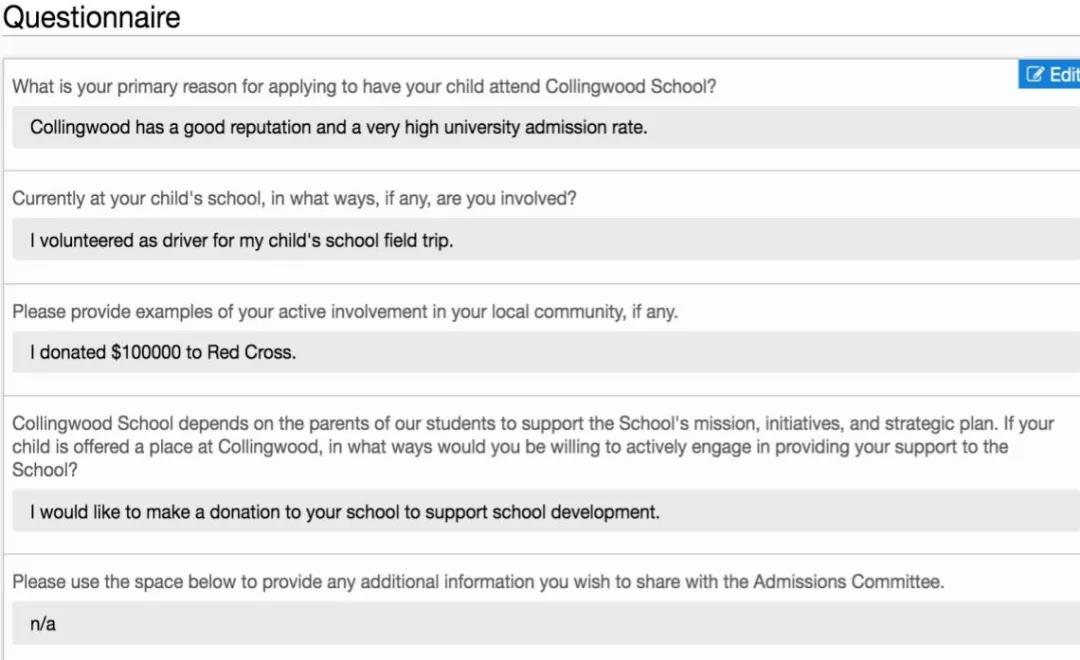 该图是知名私校Collingwood申请书内的其中一个环节,有些初次申请搞不清楚状况的家长,还以为这些提问只是"简答题",眼看申请截止日要到了,于是马虎回答了几句话,就递交了申请。可想而知这样的申请书绝对是让招生官过目即忘的。