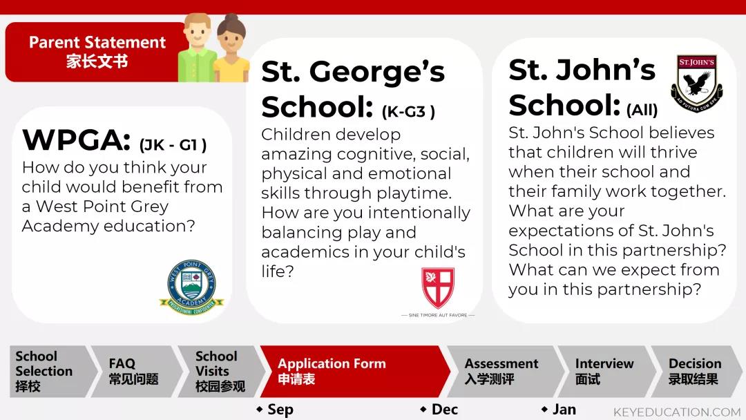 去年,为了应对申请人数的激增,许多知名私校如WPGA, Crofton House, St. George’s School, York House, St. John’s School 等等,都针对性的推出了入围筛选机制(Shortlist)。学校会初步通过评估申请文书、SSAT成绩、历年成绩单等材料,来进行层层筛选。只有通过了初步筛选的家庭才会收到入学评测与面试的邀请。这导致有许多非常优秀的家庭,由于初期准备工作的不足,非常遗憾的失去了进一步展示自己的机会。