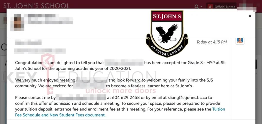 在实际经历一轮的私校申请后,我才意识到原来准备的工作是如此的繁琐且耗时。现在回头一看,幸好早在中国时就开始行动,才能够把握时间及早开始为私校申请做准备。特别要感谢KEY团队每个成员的尽心协助,由于我们对整个流程的不熟悉,加上新移民来到加拿大,时常有許多的困惑与焦虑,但每次与客服经理及顾问沟通后,都能得到一個令我们安心的答复,使我们对于私校申请更加有信心,能有方向性地推進准备工作。最令人惊喜的是原本已经做好要申请两年的准备,竟然意外的在第一年就开花结果,能够在移民的第一年就成功拿到私校的Offer,真的非常庆幸最初找上KEY这样专业且令人信赖的机构。
