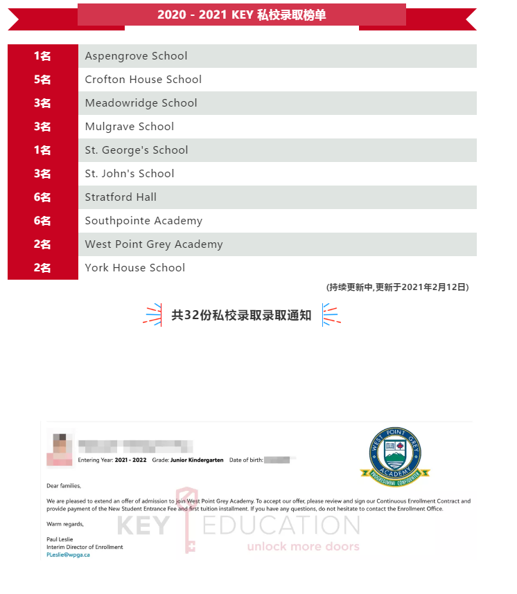 就在上周,有许多的学校都发出了"首波的低年龄段Offer",首先恭喜诸位金榜题名的家庭,在这边非常感谢大家一直以来对KEY的信任,我们很荣幸能指导帮助大家完成2020年的私校申请。疫情之下的私校申请准备,实在是不容易,但是到了这个新旧年交织的时间点,过去一年来的努力在今天换来了可喜的结果,KEY由衷地为您的家庭感到欢喜!其他尚未收到通知的家庭也请耐心等待,特别是收到等待名单(Waitlist)的家庭,目前拿到Offer的家庭必须在几日内作出是否入学的决定,也因此未来将有更多的家庭能够从Waitlist中拿下Offer,就在本周KEY又顺利地替几位家庭从Waitlist中拿下了顶级私校WPGA,Crofton House School, St. John's School …等等学校的Offer。