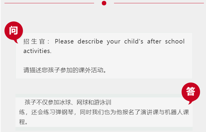 有些家长在面试前认真做了功课,把学校网站上提到的教育理念,特色课程与课外活动安排全部背下来了,希望通过展现对学校的熟悉来获得招生官的好感。然而,招生官难道会不熟悉自己学校的特色内容吗?通过这个问题,招生官真正想要了解的是这些内容与您家庭教育需求之间的关联。究竟有什么原因是您非得把孩子送到本校不可?学校的教育理念与您家庭的理念又有哪些匹配的地方?这些在回答中并没有呈现出来。
