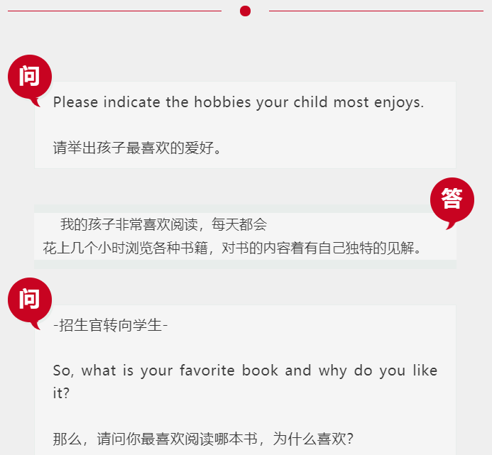 家长敏锐的察觉到,可以通过孩子阅读的兴趣爱好,体现出孩子的求知欲与好学的特质。从家长的回答成功引起招生官的好奇心,然行招生官会更进一步提问想了解更多,若是能够提出具体实例回答,那么可以成功的提升好感度。但反之若是回答过于空泛,火眼金睛的招生官很容易就能够辨别出来家长在描述孩子的兴趣是否有夸张的成分,反而弄巧成拙建立不诚实的坏印象。