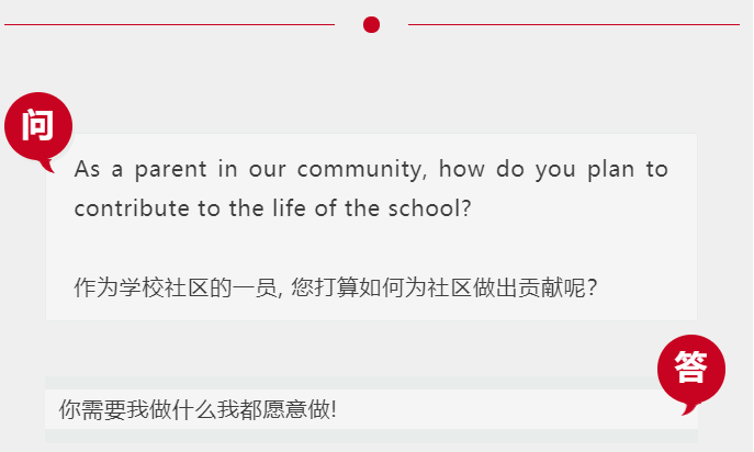 有些家长为了保守起见,采用了“万金油”的方式回答问题。然而, 这样的回答看似表达出了对学校社区支持的高度意愿,但在招生官耳里听起来却是会认为家长不清楚自己能够为学校带来什么样的贡献。
