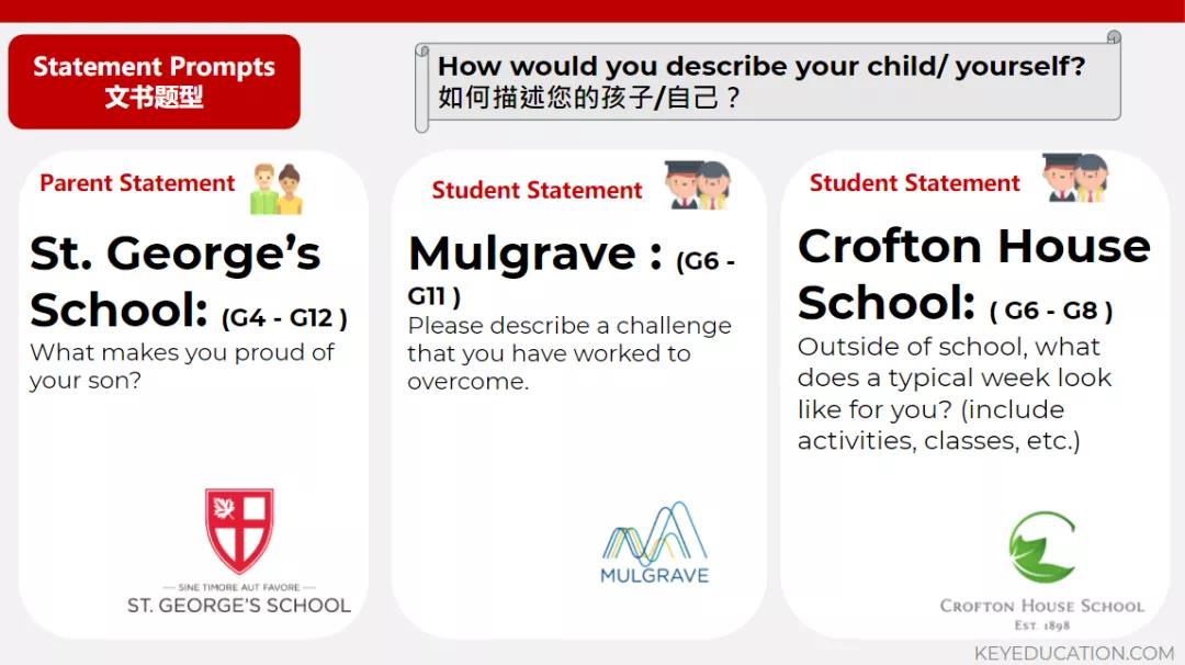 以上是今年各大私校的申请文书题型,如St. George's School的题目:「是什么让你为你的儿子感到骄傲的?」,这类的问题属于开放式问题,家长的回答也没有所谓的对与错,然而要知道每一个私校文书的题型的背后都有着招生官的巧思在里头,例如在描述您孩子的这类文书题型中,学校想要知道的是您孩子与他人与众不同的地方。能否成功给招生官留下深刻印象要点就在于你是否抓准了文书的回答方向?