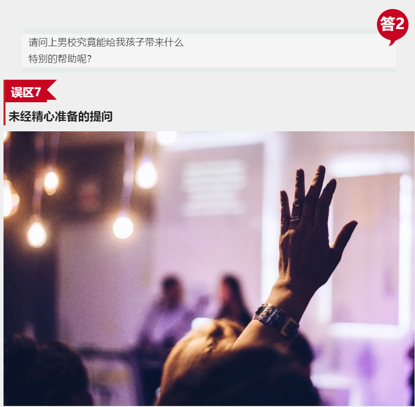 在您准备提问的时候,需要特别注意您问题也间接地反映出您个人的想法与对于孩子教育的重视。例如这个问题本身,应该是您在择校的时候就应该考虑的了,在面试的时候提出这个问题,会让招生官认为您对于您孩子要申请的学校没有了解透彻,也反映出您申请本校的意愿并不够强烈。因此提问务必要精心准备。