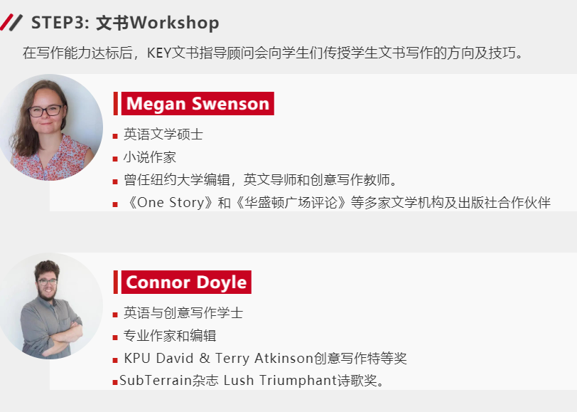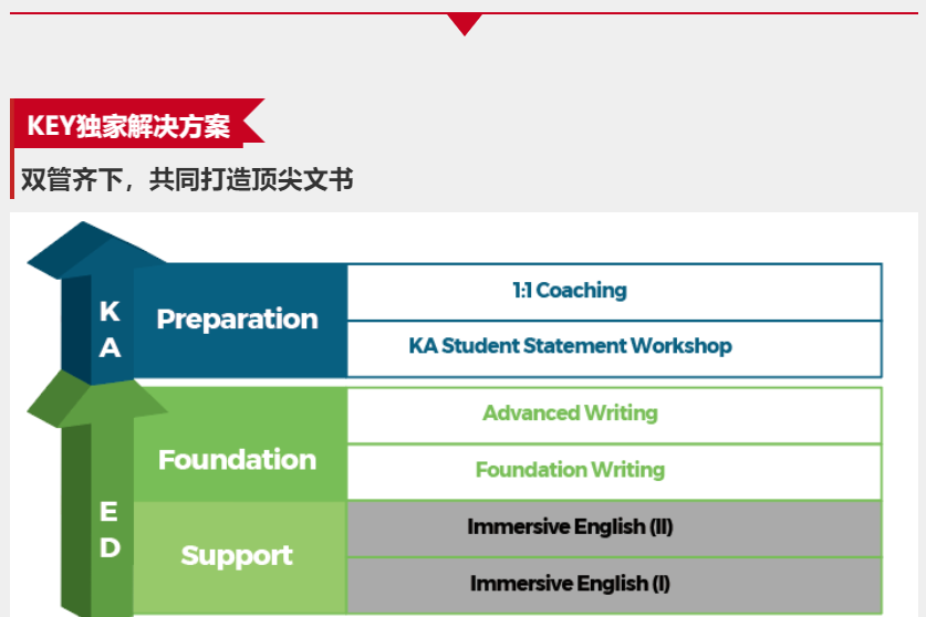 优秀的写作能力是完成高质量文书的基础。在KEY,我们会根据学生在入学评测中的表现,安排他们参加符合当前能力水平的沉浸式英语课程(Immersive English) 或基础/进阶写作课程(Foundation/Advanced Writing),进行有针对性的提升,确保他们拥有撰写合格文书的能力。