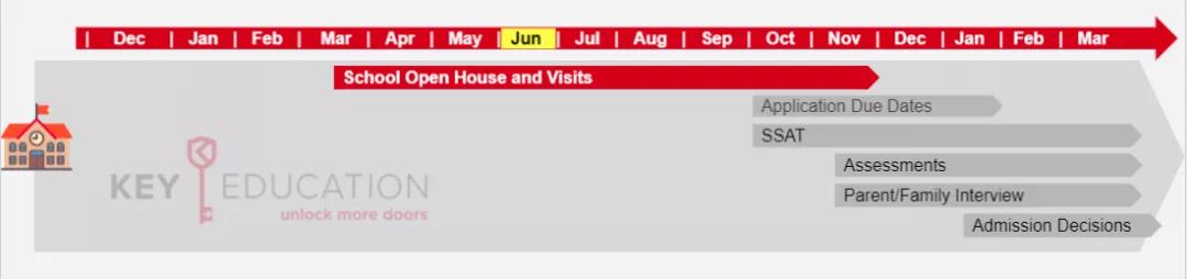 通常私校申请的流程节点大致上为:3月-11月参加校园参观(Open House)、9月学校开放线上申请系统、接着在10月至1月截止申请(Deadline),并且依照学校要求期限内缴交SSAT成绩(G4以上申请者,依学校要求而不同),并在11月中至3月举办入学测评(Assessment)与面试(Interveiew),最后就是等待申请结果。